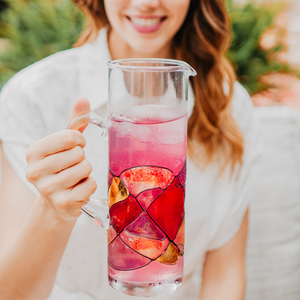Your handcrafted ‘Sagrada’ Water Pitcher holds 33 ounces. We suggest filling it with 24 ounces of water, iced tea, lemonade, sangria, margaritas, or any favorite beverage.
