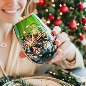 With swirling gold details, ruby and emerald ornaments, and a flourish of festive foliage — each glass feels like a celebration in your hand.