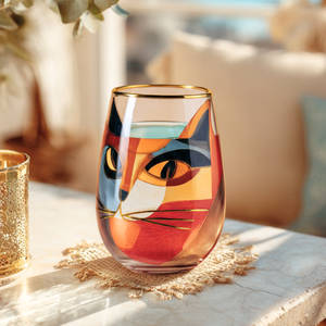 The ‘Cubist Cat’ Stemless Wine Glass.