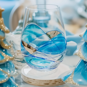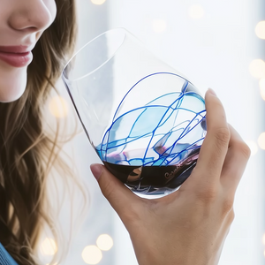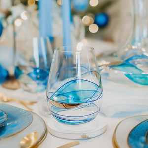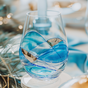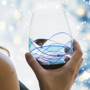 And when you hold your stemless glass to the light, the soothing blue shimmers as you swirl your wine.